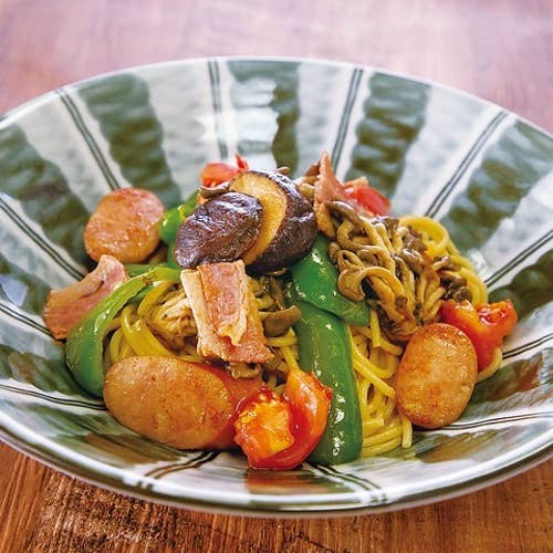アツアツの鉄板で炒めたパスタに、大ぶりのベーコンやウインナー、きのこ、ピーマンをたっぷりと使用し、